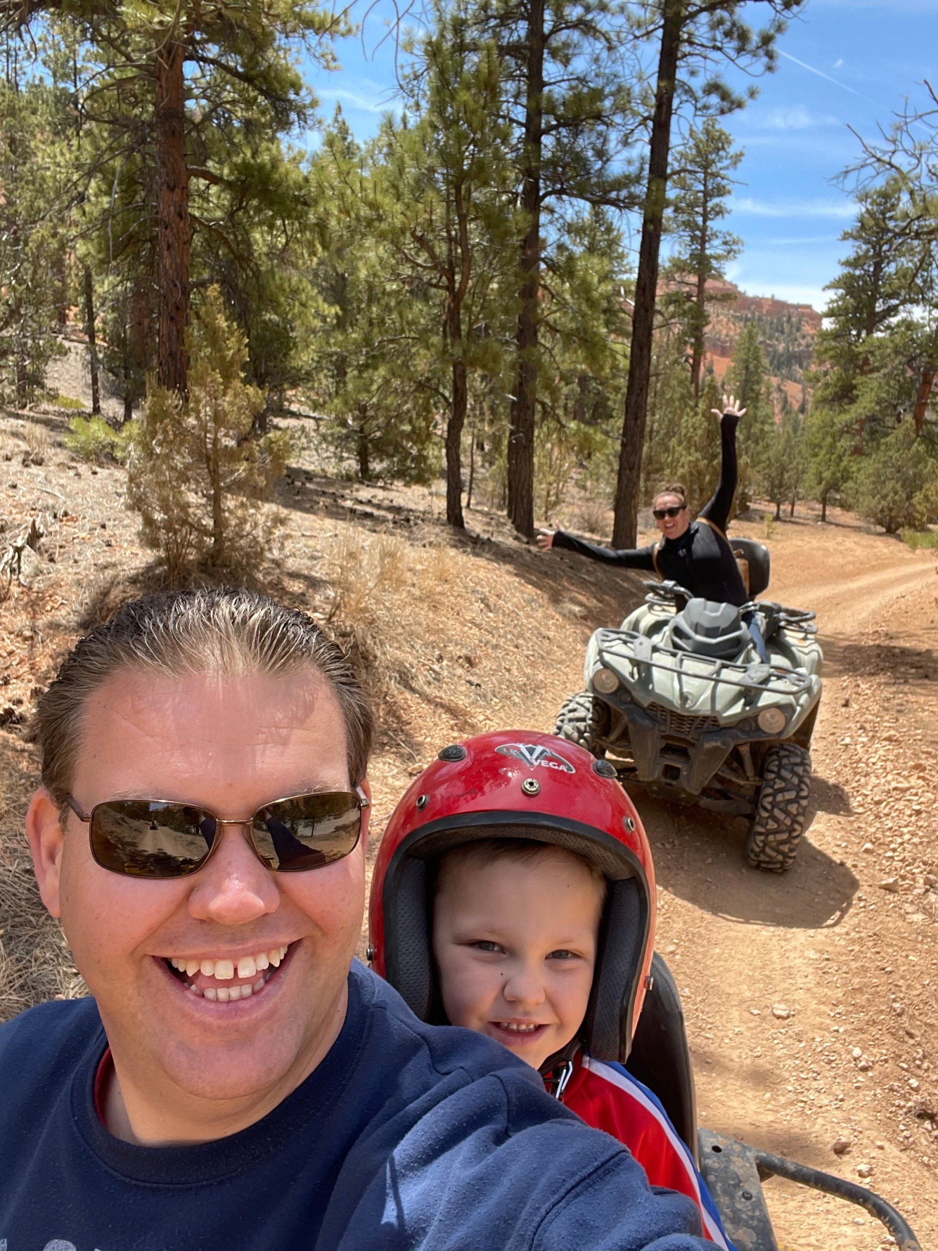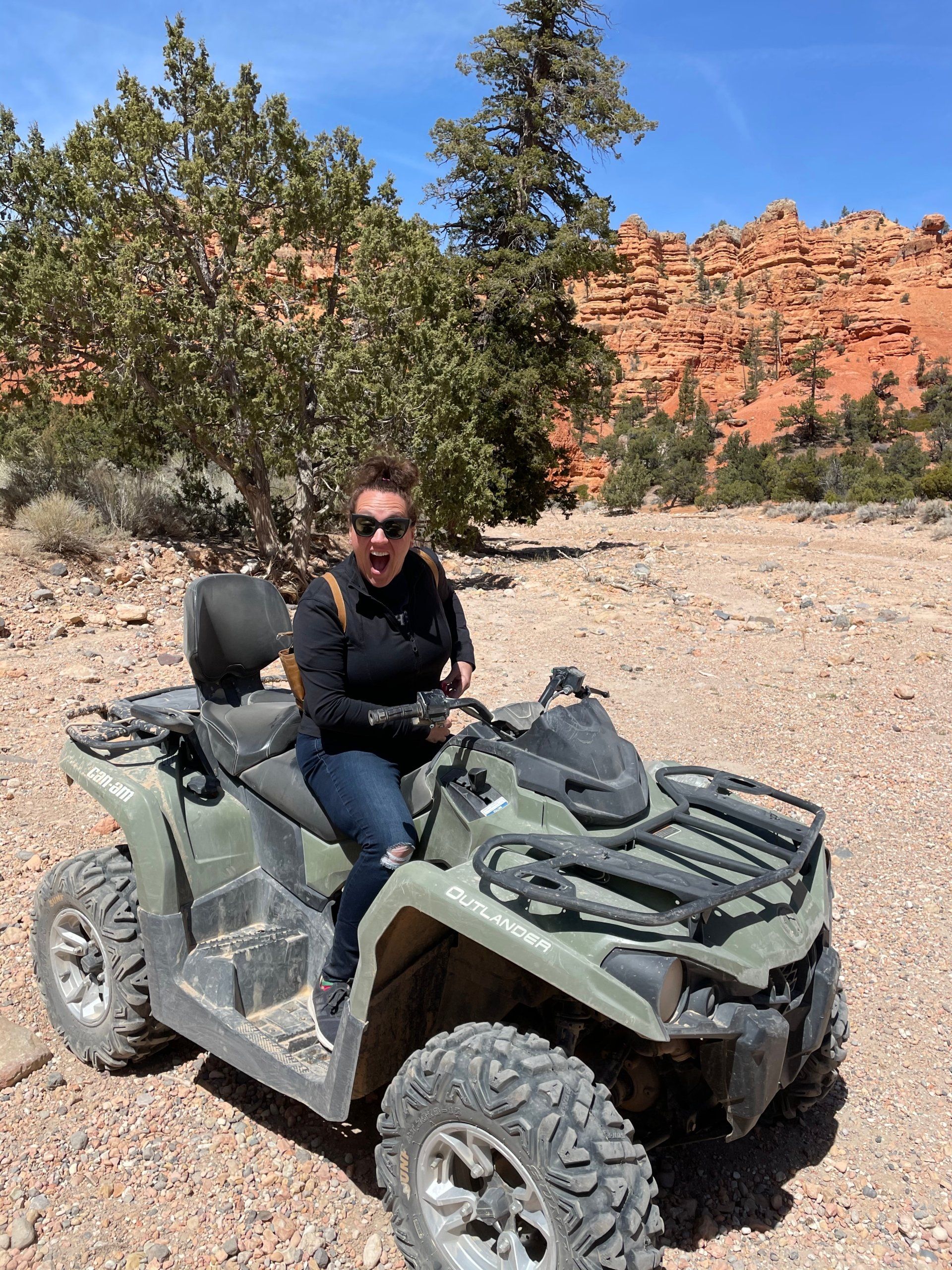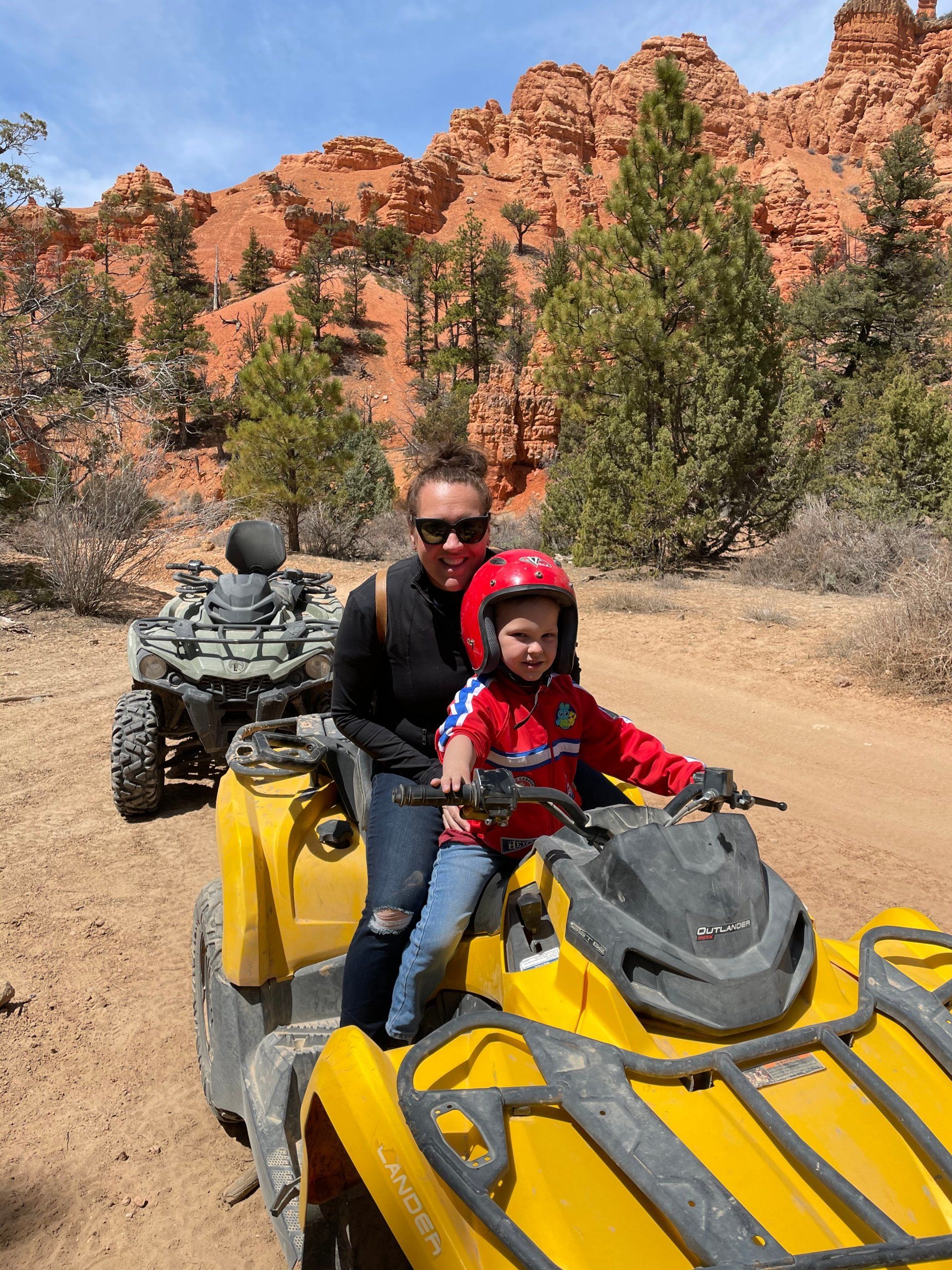 We then headed to the Bryce Canyon airport, but not to fly. At this tiny airport you can sign up for helicopter rides, airplane rides, and 4 wheeling adventures. We went on a 4-wheeling adventure through Red Canyon. Red Canyon is a short 15 minute drive from the airport. We had a private tour of some pretty amazing views on some pretty sweet rides. After our ATV side by side tour of Peek-a-Boo slot canyons in November, we knew we wanted to do something fun like this again. Touring Red Canyon on 4 wheelers was fun. Our Buddy switched off riding with each of us and enjoyed driving himself towards the end of our tour. It was so much fun. Our tour guide showed us some amazing things and allowed us to go fast and adventure in this crazy beautiful place.